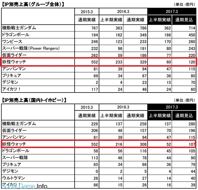 このほか、「補足資料」をみると、IP別売上高にある「妖怪ウォッチ」の落ち込みも顕著だ。第2四半期累計においてはグループ別の売上高が60億円となり、前年同期の233億円から大きく低下した。同様に、国内トイ・ホビーでも52億円と、前年同期の216億円から大きく減少した。