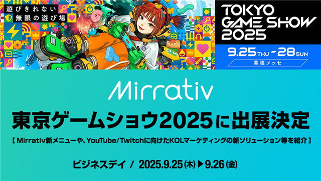 ミラティブ、『東京ゲームショウ2025』に出展 新メニュー「プラットフォームジャック」やYouTube/Twitchに向けたVTuberと共に創り上げるKOLマーケティングの新ソリューションなどをブースで紹介!