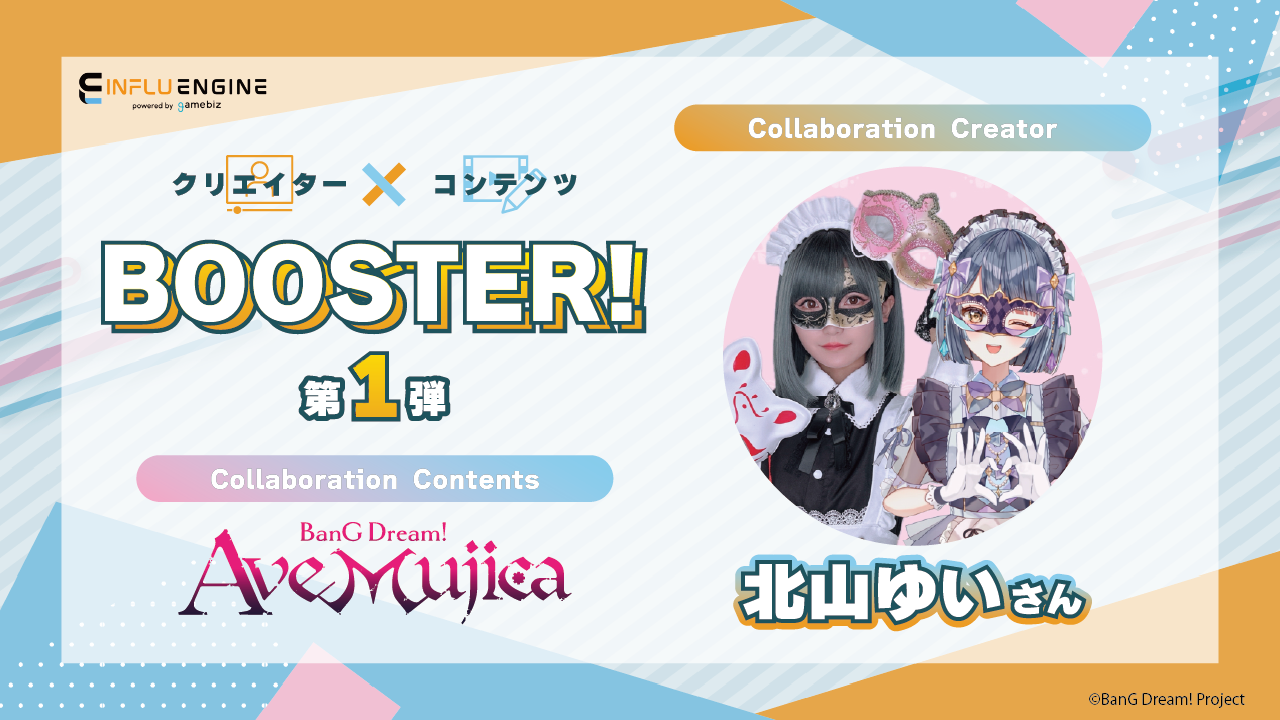 今回の「クリエイター×コンテンツBOOSTER!!」では、インフルエンジン注目のTVアニメ「BanG Dream! Ave Mujica」をテーマとしてチョイスし、SNSで活躍しているクリエイターとコラボいたします!