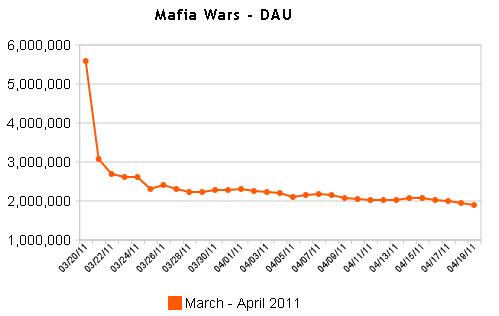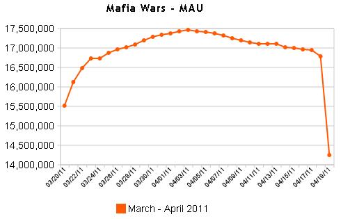 「Facebook」で運営中のZynga『Mafia Wars』のMAU(月間アクティブユーザー数)が急落している。AppDataによれば、一時は約1746万人まで回復していたMAUは、4月19日21時現在(日本時間)、1357万人にまで減少している。下のグラフをみていただけるとわかると思うが、4月18日には1678万人いたユーザーが1日で300万人以上下落した。集計ミスかと一瞬我が目を疑ったのだが、DAU(日間アクティブユーザー)を見て理由がわかった。