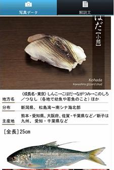 このアプリは、東京書籍「すし手帳」をアプリ化したもの。大トロ、関あじ、あいなめ、新いか、ぼたんえび、さざえ、しらうおなど94貫が収録されている。