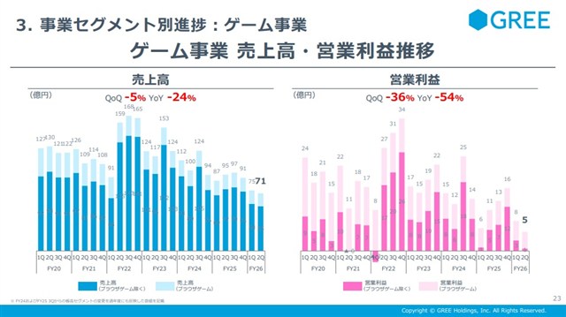 オンライン・モバイル事業は、売上高54億8000万円(同2.8%減)、営業利益5億4900万円(同50.0%減)だった。主力タイトル「100万人の信長の野望」、「100万人の三國志」、「100万人のWinning Post」が安定した収益で推移した。また「AKB48の野望」や「100万人のNINJA GAIDEN」、「真・三國無双 SLASH」などスマホ専用タイトルもリリース。台湾・香港・マカオにおいて「のぶニャがの野望」、「100万人の三國志 Special」のサービスを開始したとのこと。