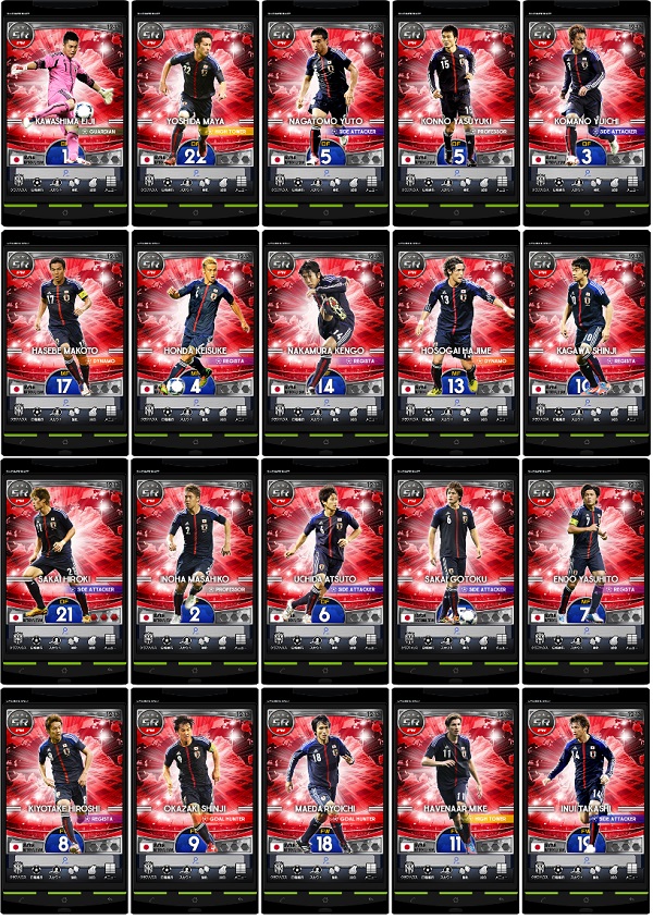 なお、今回のリリースを記念して、チュートリアルを突破したプレイヤー全員に、ゲーム内で使える、サッカー日本代表実写レアカードを期間限定でプレゼントする(下記カードから1枚プレゼント)。