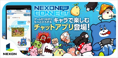 『NEXONコネクト』は、ゲームのキャラクター同士で無料メールやスタンプが送り合うチャットサービス。ネクソンの運営するオンラインゲームのキャラクター情報と連動しており、ゲームの友だちやギルドメンバーたちとスタンプや絵文字を用いたチャットが楽しめる。