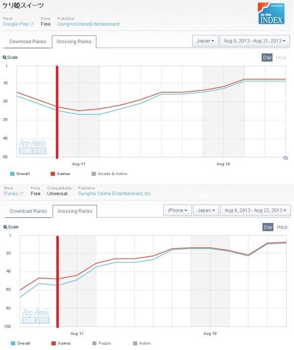 【売上ランキングの推移、上:GooglePlay、下:App Store】