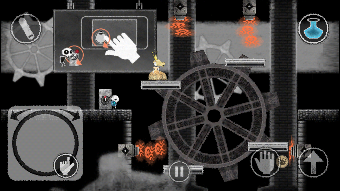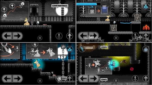 PSVitaから装いも新たにスマートフォンで登場した『Dokuro』。本作は、白く温かみのあるチョークタッチで描かれた絵本のような世界を舞台に、多彩なギミックを解き明かし、魔王城から姫を助け出すアクションパズルゲームである。今回、操作性に富んだコンシューマ端末機から一転、タッチ操作が主流のスマートフォン端末へと移り変わった。コンシューマ作品がスマートフォンアプリとして移植されることは、これまでも幾多ものタイトルを見てきたが、その際にどうしても心配されるのが操作性である。ボタンや十字キー、スティックなどを持ち合わせていないスマートフォンに、「操作が悪い」と感じるのは至極当然のことだ。