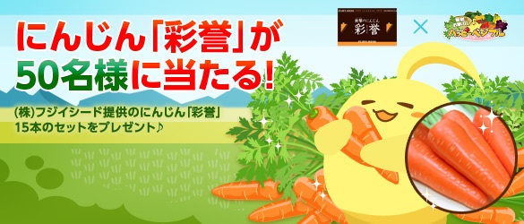 NHN PlayArtは、本日(12月19日)、 PC版・スマートフォン版「ハンゲーム」で提供中のソーシャル農園シミュレーションゲーム『ハッピーベジフル』で、フジイシード提供のにんじん「彩誉(あやほまれ)」プレゼントキャンペーンを開始した。2014年1月9日まで開催される予定。今回開始するスタートするキャンペーンは、フジイシードとのタイアップ企画で、鮮やかな濃紅色で肌もなめらかな美しさ、臭みも少なく子供が喜ぶ甘いにんじん「彩誉」を抽選で50名にプレゼントする。ゲーム内の野菜の収穫時に一定確率で抽選券が得られ、抽選券が5枚集まると、1回の抽選に挑戦することができる。当選人数に達し次第、キャンペーン終了となるので注意して欲しい。
