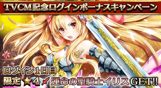 1月11日~20日の期間中にログインした全ユーザーに、ログイン1日目限定で、★4「運命の聖騎士イリス」をプレゼントする。