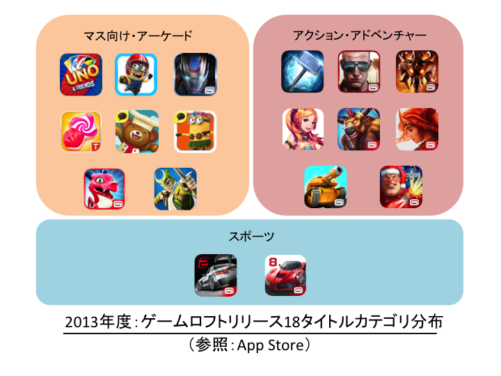 そして、同社は、アイテム課金のビジネスモデルの成功によって、市場での成長を収めた、としている。現在、仮想アイテムと広告による売上は、同社のスマートフォンの売上のうち80%以上を占めている。このアイテム課金モデルによって、同社は市場での存在価値を高めるきっかけとなった。実際、直近30日間で、1億6000万人以上が、スマートフォンやタブレット端末上で同社のゲームアプリをプレイしている。このアイテム課金モデルによって、同社は、同社のゲームアプリの寿命を延ばし、より長い間ユーザーがプレイすることを可能にした。2013年に同社がリリースしたゲームアプリは、2013年の同社の売上の75%を占めている。2013年にリリースした同社のゲームタイトルは、下記図を参照。