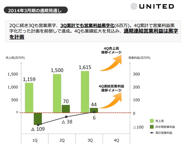 ユナイテッド<2497>は2月4日、2014年3月期第3四半期(2013年4~12月)の連結決算を発表した。売上高は前年同期比55%増の43.39億円、営業利益は600万円の黒字(前年同期は5200万円の赤字)、経常利益は1800万円の黒字(同3900万円の赤字)、四半期純利益は2100万円の赤字(同2.12億円の赤字)だった。スマートフォン向けアプリ『CocoPPa(ココッパ)』などメディア事業が順調に立ち上がったほか、広告事業も好調だった。メディア事業の売上高は21.8億円(前年同期は1400万円)と急速に成長し、利益は1.43億円の黒字(同6700万円の赤字)に浮上した。『CocoPPa』のダウンロード数は2014年1月26日に全世界で2000万を突破。新たな収益手段として課金コンテンツ販売やタイアップ広告の取り扱い、NTTドコモの提供する月額サービス「スゴ得コンテンツ」への提供を始めた。