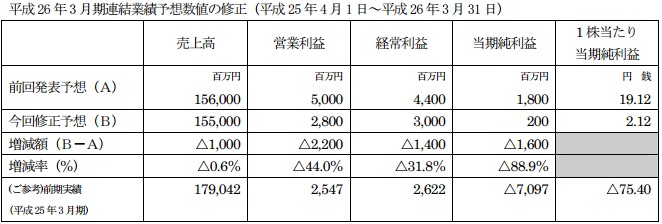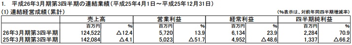 同時に発表した第3四半期累計(2013年4~12月期)の連結は、売上高1245億円(前年同期比12.4%減)、営業利益57億円(同13.9%増)、経常利益61億円(同23.9%増)、四半期純利益22億円(同70.9%増)だった。