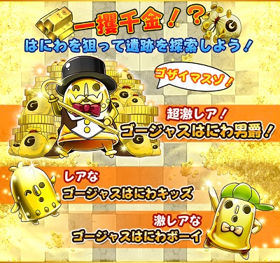 毎週土日に開催するスペシャルダンジョン「はにわ黄金遺跡」でも上位クエストとして「アドベンチャー級」が新たに登場する。「はにわスタジアム」と同様、「ゴージャスはにわシリーズ」の最上位版「ゴージャスはにわ男爵」が入手できるチャンスがある。「アドベンチャー級」で一定確率でドロップする。