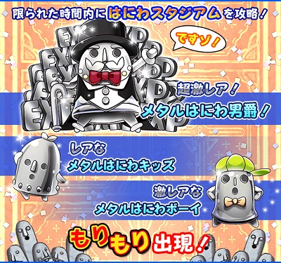 ヒーローを高成長させる「メタルはにわキッズ」や「メタルはにわボーイ」が獲得できる「はにわスタジアム」が毎日出現する。さらに今回、「メタルはにわシリーズ」最上位ユニットとなる「メタルはにわ男爵」が一定確率で手に入る「メジャー級」も新たに登場する。