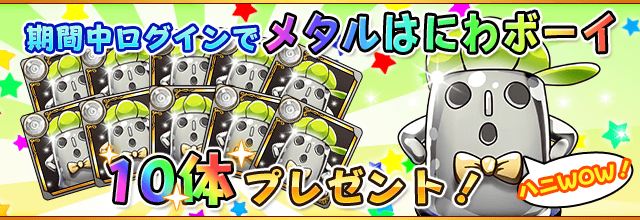 「メタルはにわボーイ」10体をキャンペーン期間中のログイン1回限定でプレゼント!! またキャンペーン期間中は「メタルはにわキッズ」を毎日20体プレゼント。