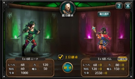 新しく雇用した傭兵に傭兵のレベルと増強値、紋章強化の一部を能力継承できます。