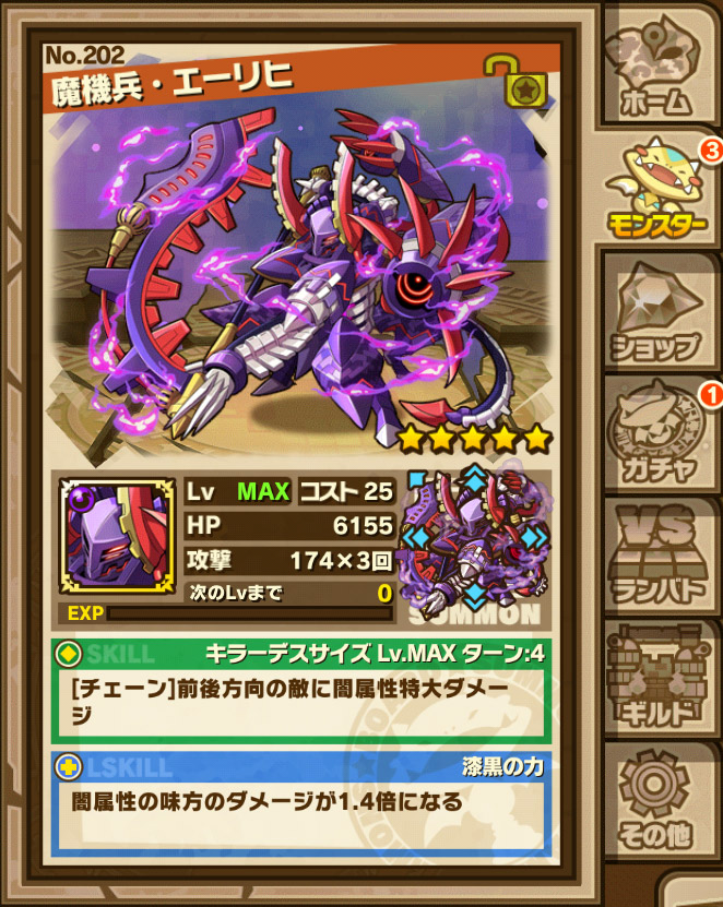 2014年5月5日(月)よりイベントダンジョンに新たな「機兵」として「闇晶殿の守護者」が登場。「ビュルテ闇晶殿」で待ち受けるのは闇のクリスタルの力を秘めた、「機兵エーリヒ」です。過去に出現した「機兵」に比べ攻撃力は控えめとなっているが、手にした鎌を使って広範囲に向けて攻撃を仕掛けていく。そのため、バトル中はモンスターの配置を考慮した移動や攻撃が重要になる。「機兵エーリヒ」に打ち勝つことができれば「魔機兵」をドロップすることがある。「魔機兵」は進化させることで「魔機兵・エーリヒ」となりさらに強力なモンスターとなる。