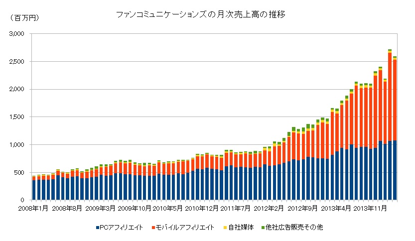 ファンコミュニケーションズ<2461>は5月15日、2014年4月の月次業績(速報)について、前年同月比57.2%増の25億9600万円だったと発表した。昨年8月以来、9カ月連続で20億円台超えとなり、さらに前月に続いて25億円の大台を上回った。5月8日に好決算を発表した同社だが、引き続き好調を維持しているようだ(関連記事)。同社の発表したリリースによると、「Moba8.net」と「NEND」を中心とするモバイルアフィリエイトが引き続き好調で、同114.9%増(約2倍)の14億5600万円と全体の伸びをけん引した。また「A8.net」を中心とするPCアフィリエイトサービスも同21.9%増の10億7600万円となるなど引き続き好調だった。