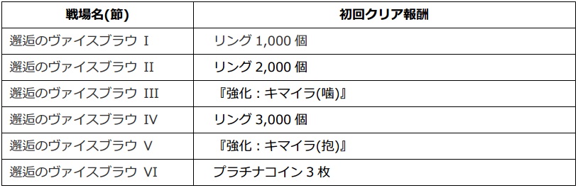 ※邂逅のヴァイスブラウII以降は邂逅のヴァイスブラウ戦場をクリアすることで順次挑戦が可能になる。