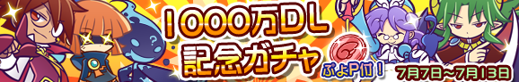 セガネットワークスは、本日(7月7日)、iOS/Android 版『ぷよぷよ!!クエスト』が合計1000万ダウンロードを達成したことを記念して、人気キャラクターが登場する期間限定ガチャを実施すると発表した。