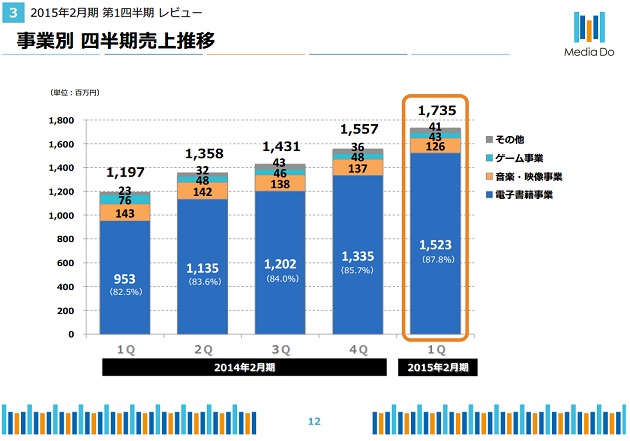 全体の売上高の90%近くを占める電子書籍事業が好調に推移したことが主な要因。同事業の売上高は前年同期比で59.8%増の15億2300万円となった。「LINEマンガ」での電子書籍の販売量がサービス開始以来順調に拡大した。「LINE」の登録ユーザー数拡大と無料コンテンツの配信、購入者に限定「LINEスタンプ」を提供するなどの施策が奏功したとのこと。