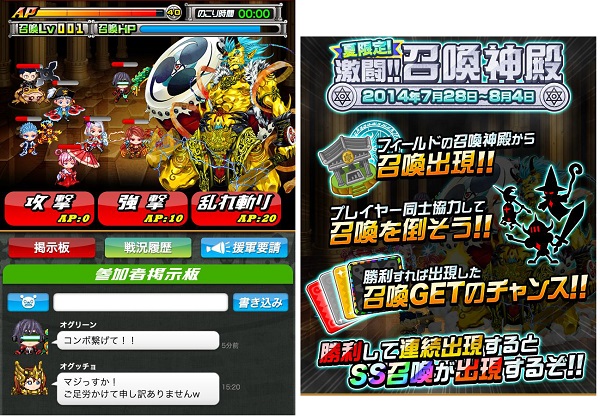 キャンペーン アソビズム、Androidアプリ『ドラゴンリーグA』でフィールドイベント「激闘!!召喚神殿」を開催…SS召喚「浴衣ドラ子」に遭遇するチャンス ドラゴンリーグA 2014.07.28 16:35 アソビズムは7月28日、Androidアプリ『ドラゴンリーグA』において、フィールドイベント「激闘!!召喚神殿」を開催すると発表した。本イベントは、他メンバーと協力し、フィールドの召喚神殿から出現した強力な召喚たちと激闘を繰り広げる連携型フィールドイベントだ。バトルに勝利すれば、出現した召喚を獲得できるチャンスとなる。SS召喚「浴衣ドラ子」に遭遇する可能性もあるという。 参加者で共有する「AP」を消費して実行する「攻撃」「強撃」「乱れ斬り「神速八突」「魔導光線」の5種類のコマンドを使って、召喚とのバトルを行う。本バトル中は「AP」で攻撃するため、通常リーグで使う「技P」は使えない。 開催日程は7月28日から8月4日まで。開催期間中は、召喚神殿に入る時に使うとSレア召喚に必ず遭遇できるイベント限定アイテム「金のグリモア」が、ログインした際に1日1つ配布される。 ■『ドラゴンリーグA』 Google Play © 2013 Asobism Co., Ltd.