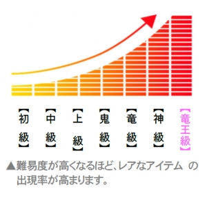 本ダンジョンの難易度は、最高難易度である「竜王級」を含み、全部で7段階。難易度が高いダンジョンほど、強化素材などのレアなアイテムの出現率が高くなります。