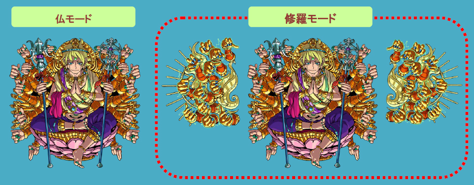 ボスモンスター「千手」は、バトルの途中から戦闘モードが変化します。戦闘モード「仏モード」から「修羅モード」に切り替わると、「千手」の腕が増え、攻撃力アップ!! 増えた腕を倒すと「修羅モード」が解かれ「仏モード」に戻りますので、早めに腕を倒しましょう。