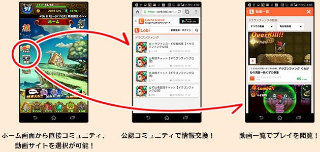 今回の導入により、プレイヤーは、簡単な操作で、ゲームの実況配信が可能になる。録画されたプレイ動画は、YouTube、Twitter、LINE、Facebook、Lobi などのSNSへ簡単にシェアができるという。また、Lobi内に、ドラゴンファング専用コミュニティも用意されており、全国のプレイヤーとゲーム情報の交換なども行える。