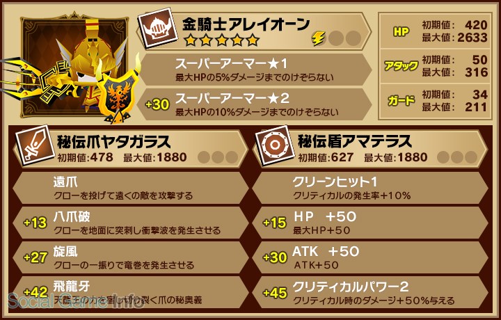・クローの秘奥義スキルを使える「秘伝爪ヤタガラス(★5)」を装備した「金騎士アレイオーン(★5)」