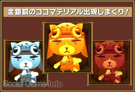 「ココロイド」に合成すると、大量の合成ポイントを入手することができる「ココマテリアル」たちが続々と出現する「ミリオンクエスト」が期間限定で復活する。「ココマテリアル」の種類は「金」「銀」「銅」の3種類。どの「ココマテリアル」も大量にドロップするという。