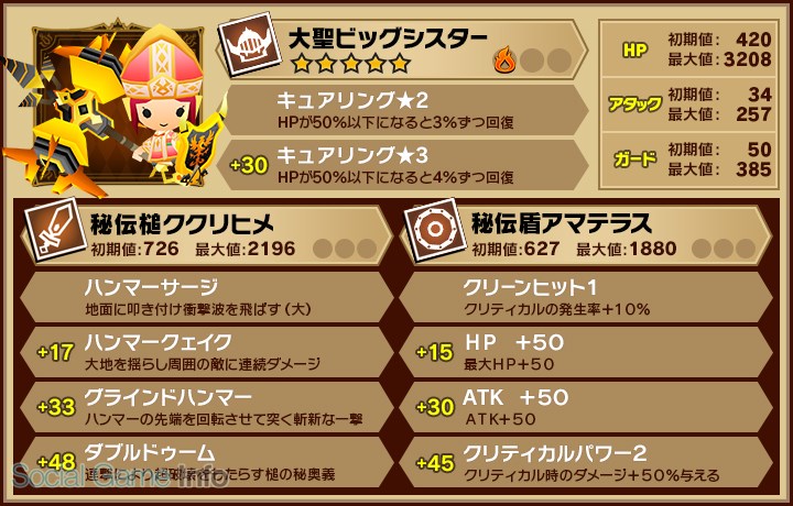 ・ハンマーの秘奥義スキルを使える「秘伝槌ククリヒメ(★5)」を装備した「大聖ビッグシスター(★5)」