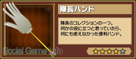 隊長の貴重なコレクションは、「隊長フライパン」や「隊長コケシ」、「隊長ナベブタ」など一風変わったものばかり。しかし、フライパンは「アックス」として、コケシは「ハンマー」として、そしてナベブタは「盾」として装備できるなど、実用性を兼ねたユニークなアイテムとなっている。