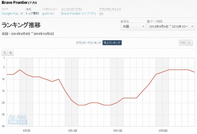 10月4日16時現在(日本時間)の米Google Play売上ランキング(ゲームカテゴリー)では、上位6タイトルと変わらず。Supercellの『Clash of Clans』が31週連続の首位となり、King『Candy Crush Saga』、Machine Zone『Game of War - Fire Age』、King『Farm Heroes Saga』、Supercell『Hay Day』などとなった。今週は、gumiの『Brave Frontier』が7位にランクインした。10月1~2日には過去最高位と並ぶ6位となった。Facebookページの「100万いいね!」到達を記念して実施した「ジェム」の増量セールは、当初、9月29日まで行われる予定だったが、好評につき10月1日まで延期されたという。