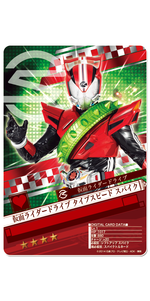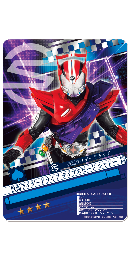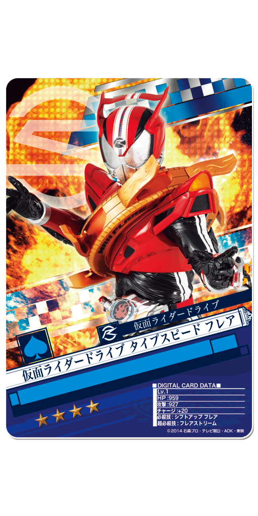 《ドライブチャレンジ!》では、新番組の主人公である《★3 仮面ライダードライブ タイプスピード》を入手することができます!アイテムを集めることでブレイクさせると、より強力なカードにする事が可能です!!現在用意されているブレイク先は3種類!!