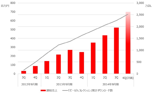 ■「だーぱんコレクション」の累計ダウンロード数とイグニス連結売上の推移