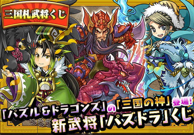 『パズル&ドラゴンズ』で人気の高い「三国の神」である「呂布」や「臥龍神・諸葛亮」、「忠義神・関羽」などをはじめとした三国志でもその名を馳せる有名な武将たちが必ず的中する「新武将“パズドラ”くじ」が、期間限定で登場します。
