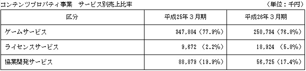 一方、コンテンツプロパティ事業は、「桃色大戦ぱいろん・ぷらす」のような自社システムによるPCオンラインゲームの運営に加え、PC向けSNSへのPCブラウザゲームの提供、「メサイヤ」ブランドなどのライセンスサービスを展開。直近では「つみにん~うみにん大サーカス~」を2014年1月に配信開始するなどスマートフォン向けゲームアプリにも取り組んでいるほか、ソリューション事業を通じて顧客から持ち込まれるスマートフォンアプリ、オンラインゲーム、家庭用ゲームなどの開発案件を協業というスタイルで行う協業開発サービスも展開している。なお、11月14日には、「メサイヤ」ブランドに係るゲームソフトの全ての著作権について、日本コンピュータシステムから取得(関連記事)している。