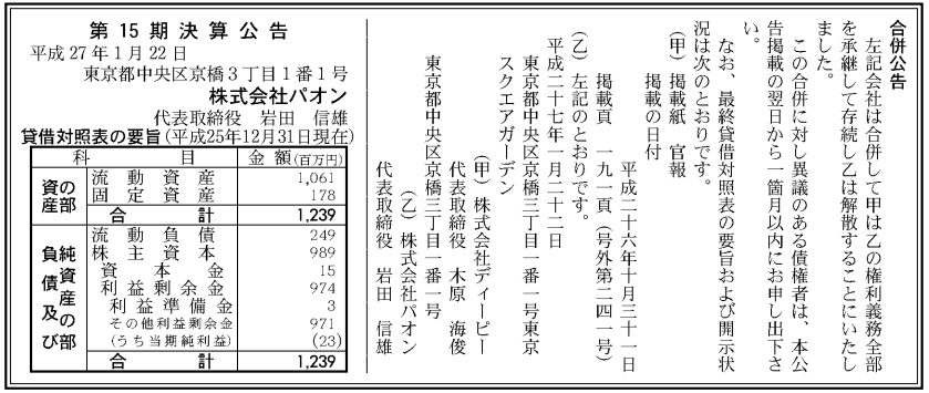 なお、パオンの最終貸借対照表(第15期:2013年12月期)では、当期純利益が2300万円だった。