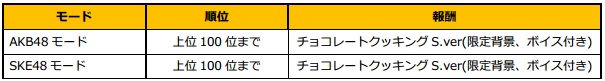 期間中、楽曲「口移しのチョコレート(AKB48モード)」、「チョコの奴隷(SKE48モード)」(難易度HARD)のスコアランキングで入賞するとイベント終了後、順位に応じた報酬を得ることができる。