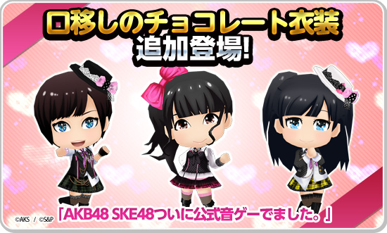 2月5日(木)より集めたポイントに応じて、様々な報酬が手に入る「バレンタインイベント」を実施した。「バレンタインイベント」は対象楽曲をプレイして、イベントポイントを集める事で報酬が得られるイベント。また新楽曲「口移しのチョコレート(AKB48モード)」「チョコの奴隷(SKE48モード)」を追加し、