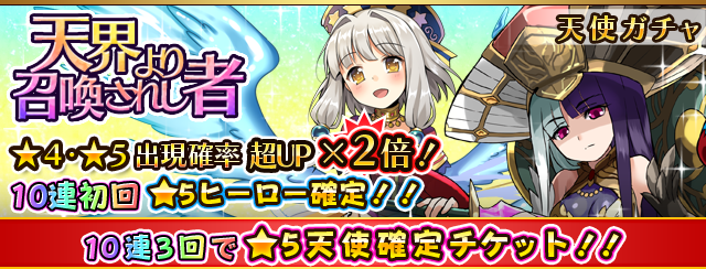 特殊通常ショットをもった新たな★5天使ヒーローが登場! レア出現率2倍の他、10連召喚では★5確定や天使チケットなど豪華オマケつき! 初登場の無属性天使ヒーローを含む、レア種族「天使」を入手する機会をお見逃しなく!
