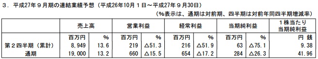 なお、2015年9月期通期の予想については、従来予想から変更なく、売上高89億4900万円(前期比13.2%増)、営業利益6億6000万円(同15.5%減)、経常利益6億5400万円(同17.2%減)、当期純利益2億8400万円(同26.3%減)の見込み。