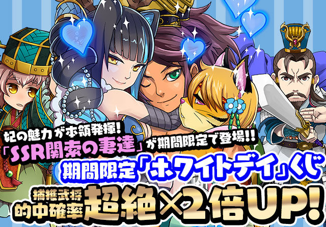 女性武将で構成される軍団をさらに強化する「SSR関索の妻達」を期間限定で加え、「SSR劉備」をはじめとした武将の「捕獲」を戦術または特技に持つ武将が超絶×2倍UPとなる「三国札武将くじ」イベント「ホワイトデイ」くじ。