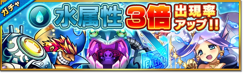 内容:24 時間限定で、「プレミアムガチャ」にて、★3~★5の全レアリティの水属性の出現確率が3倍にアップ。