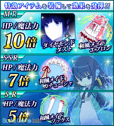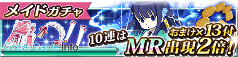 イベント連動の「メイドガチャ」に司波深雪の魔法式「ダイヤモンドダスト(MR)」やコスチュームの「和風メイドシリーズ」が新規投入された。メイドガチャは単発ガチャを1日1回「80MC」でお得に回すことができる。さらに10連ガチャはMRなどの高レアリティの出現率が2倍になり、ショートブレッドが13個おまけで付与されるとてもお買い得なものになっている。また、今回新規投入されたアイテムは開催中イベントの特効アイテムとなっており、パーティーメンバーが装備するとHP、魔法力が増加する。「ダイヤモンドダスト」と「和風メイドエプロン」はHP、魔法力が「10倍」に上昇するので、開催中イベントでバトルの際に活躍が期待できる。強力な魔法式やコスチュームを出現率の高いこの機会にぜひゲットしよう!