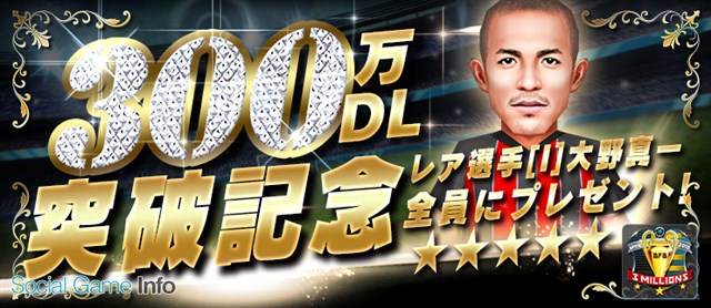 「300万ダウンロード記念ガチャ」は、「レア度★4、5」の優良選手のみを集めたガチャ。「300万ダウンロード記念ガチャチケット」1枚で、「300万ダウンロード記念ガチャ」を1回引くことができる。「300万ダウンロード記念ガチャ」で入手できる選手は「[I]大野真一、[I]稲庭俊二、[I]四斗須、[I]佐持朗、[I]大河原道男、[I]ドナウジーニャ、[I]チャベ、[I]D・ファララン」の8選手の中から1選手となる。詳細はゲーム内の「お知らせ」で発表する。