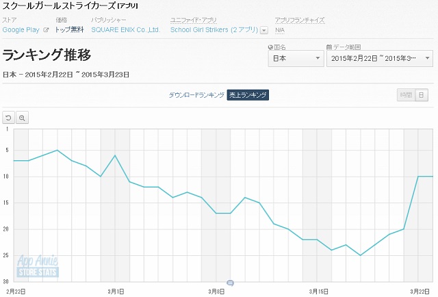また、スクウェア・エニックス『スクールガールストライカーズ』もTOP10に復帰。3月20日より本日より開始するイベント「協力戦」に先立ち、特攻ガチャのアップデートを行っており、売り上げを伸ばしている模様だ。同時に、「ヤングガンガン」とのコラボ企画第3弾なども実施している。