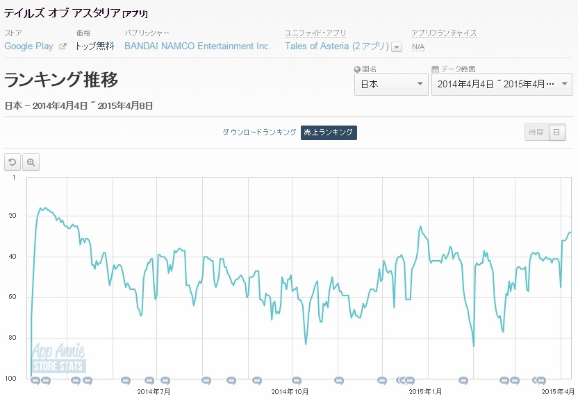 ランキングの動きで注目したいのは、バンダイナムコエンターテインメントとKLab<3656>の『テイルズ オブ アスタリア』がじわじわと26位まで順位を上げてきたことだ。『テイルズ オブ アスタリア』は3月31日より、1周年記念キャンペーンを開始(関連記事)しており、「星のカケラ」編の主人公である、クレス、ロイド、ルーク、ユーリ、ソフィ、ミアのスペシャル描き下ろしイラストが登場する限定召喚を実施していることなどが売り上げにつながっているようだ。