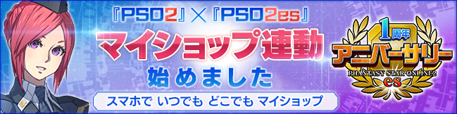 ・配信内容:「マイショップ」機能の実装を記念して、期間中に1日でも『PSO2es』のゲームにログインしたキャラクターに「PSO2esマイショップ利用券」3枚をプレゼント!