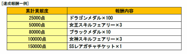 累計の貢献度が一定の値を達成すると、豪華報酬を手に入る。報酬には「女王スキルフェアリー」や「ブラックメダル」「SSレアガチャチケット」などがラインナップされている。